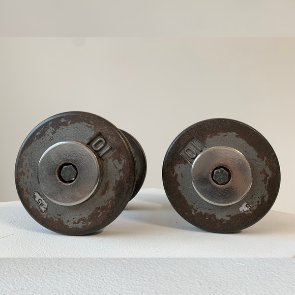 Vintage distressed cast iron adjustable dumbbells. set of 2 exercise, sport, equipment, weights, lifting, training