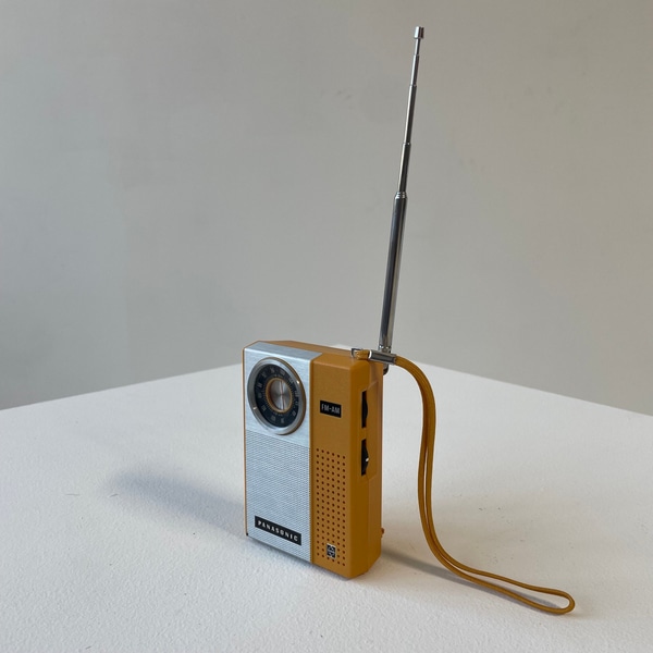 Small yellow and silver Panasonic portable FM/AM radio with an antenna. *not functional