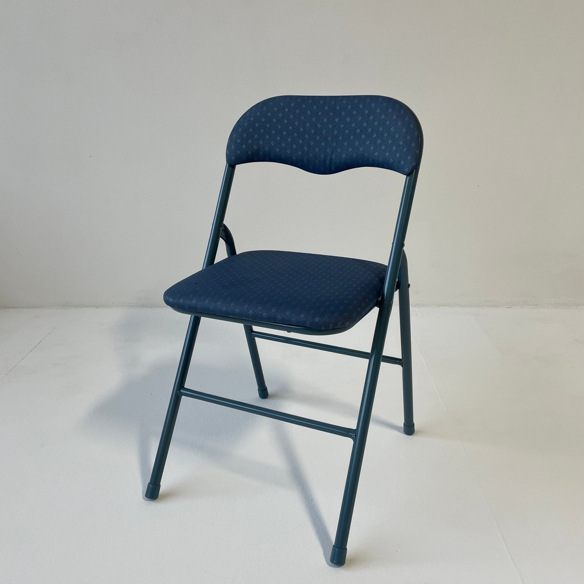 Blue patterned folding chair with padded seat.