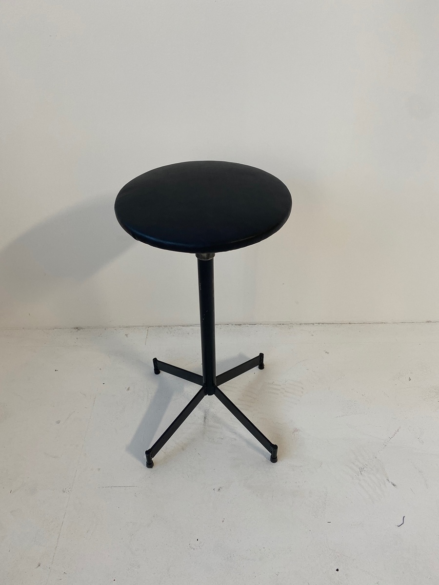 Metal pedestal stool with a black leather seat. ASK ABOUT OUR SEAT OPTIONS