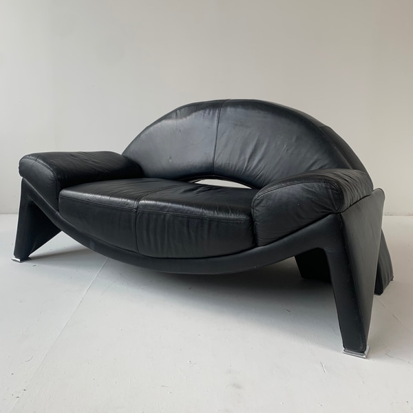 Retro, black leather sofa/couch. Abstract geometric shapes.