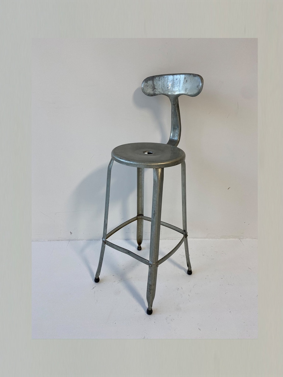 Tall silver metal stool with a back.